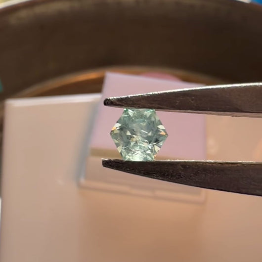 Beautiful hex cut green Montana Sapphire. Faceted by talented gem cutter Jeffrey Hill. 1.20 cts and 5.7mm. Stock #1003h25